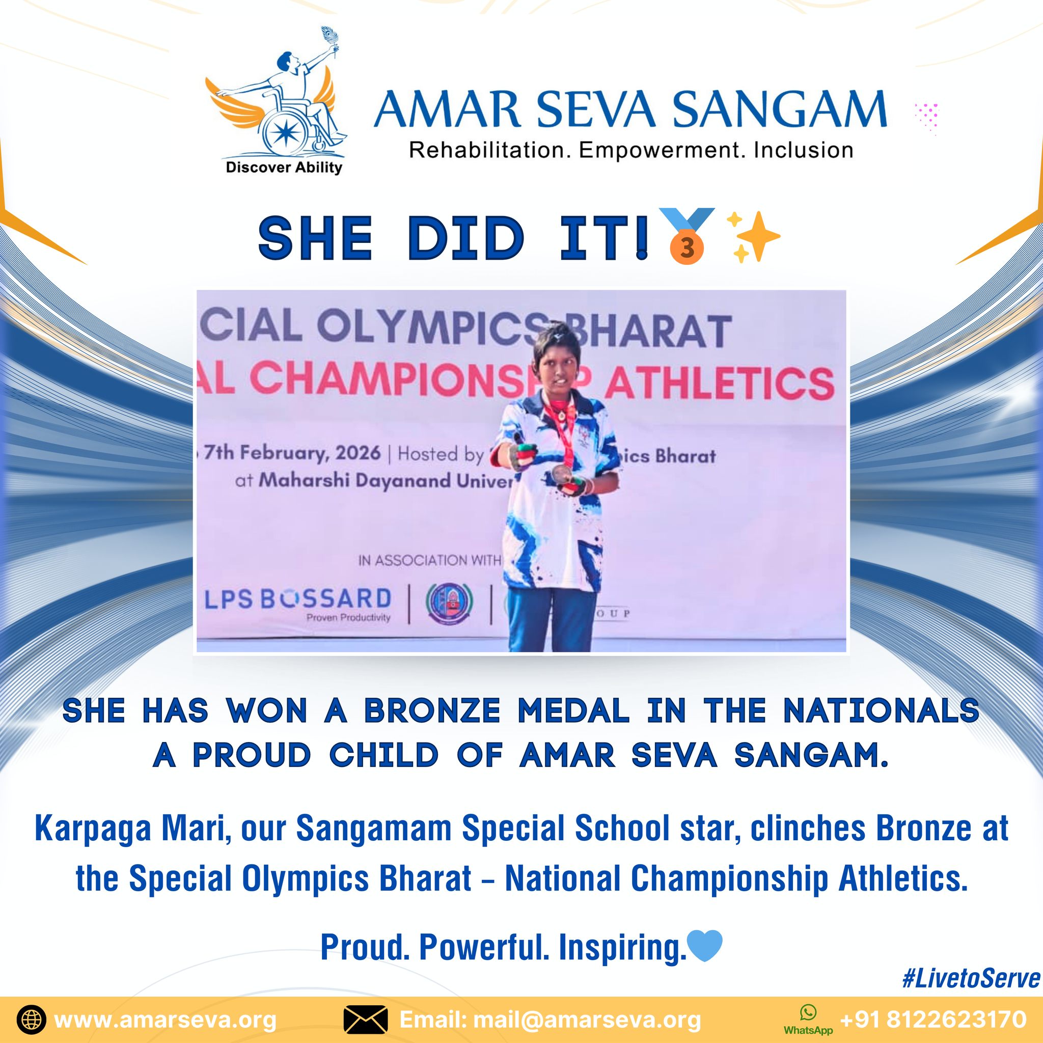 Amar Seva Sangam proudly celebrates a remarkable achievement by Karpaga Mari, a shining star of our Sangamam Special School, who has won a bronze medal at the Special Olympics Bharat – National Championship Athletics held on 7th February 2026. Her accomplishment is a true reflection of determination, hard work, and the spirit of never giving up.
